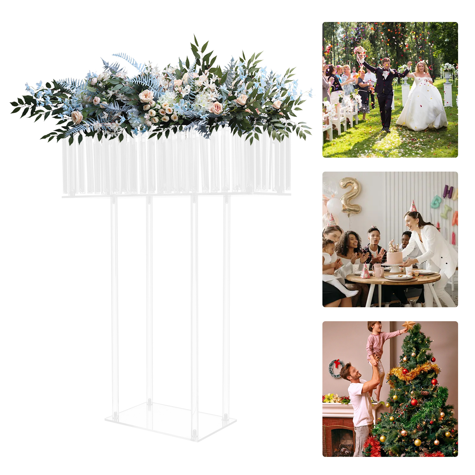 Round Edges: They not only enhance the aesthetics of the product but also improve safety during installation, cleaning, and use. Multiple Pendants: They are sparkling clear, which can increase the visual effect and beauty of the product. Application This product can be used to display your favorite flowers or other decorations. It is suitable for wedding decorations, parties, birthdays, celebrations, home decor, living rooms, courtyards, gardens, balconies, cafes, hotels, and so on.