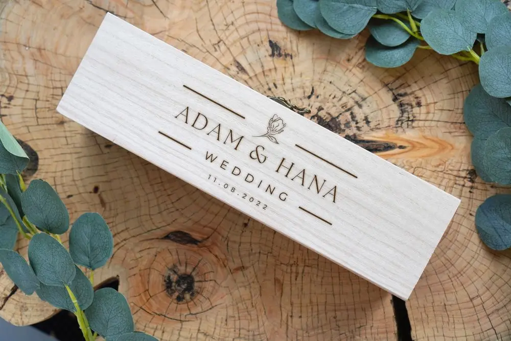 Personalised Wooden Wine Box Wedding Decoration Engraved Lettering Gift Portable Clamshell Solid Wood Champagne Bottle Box