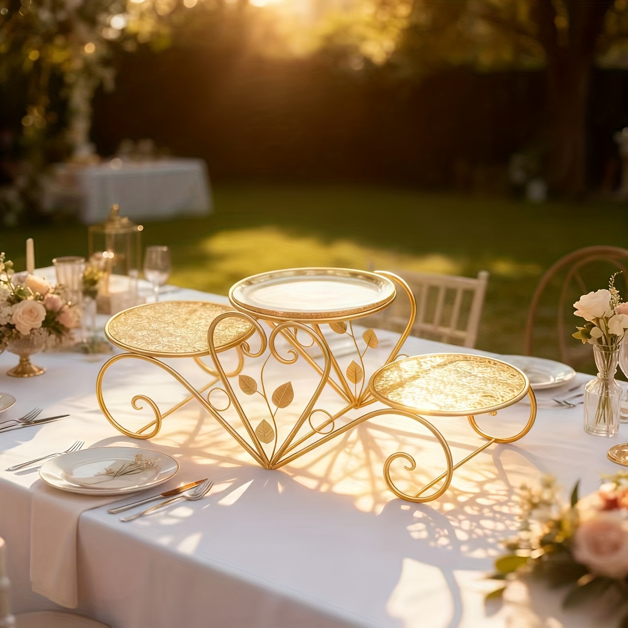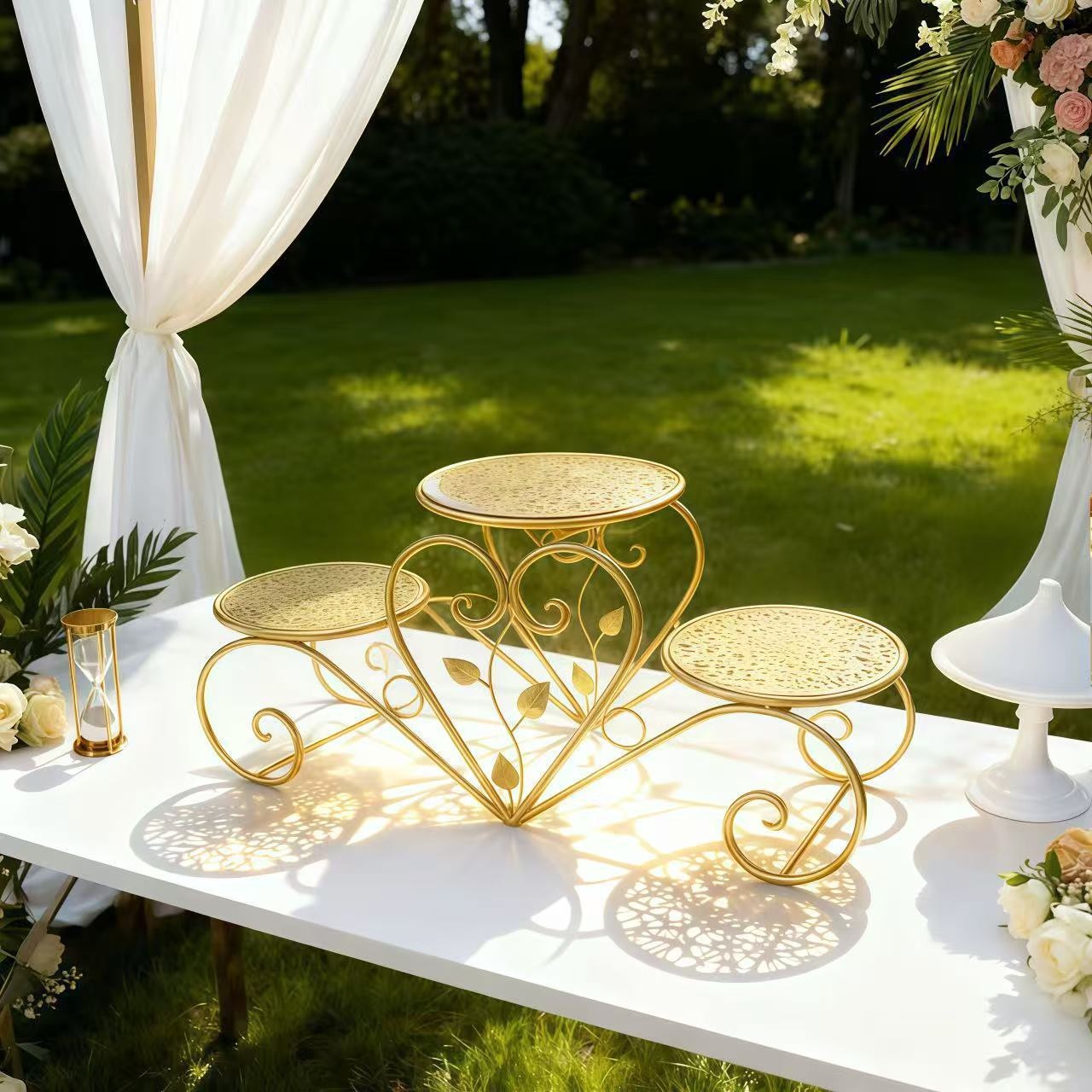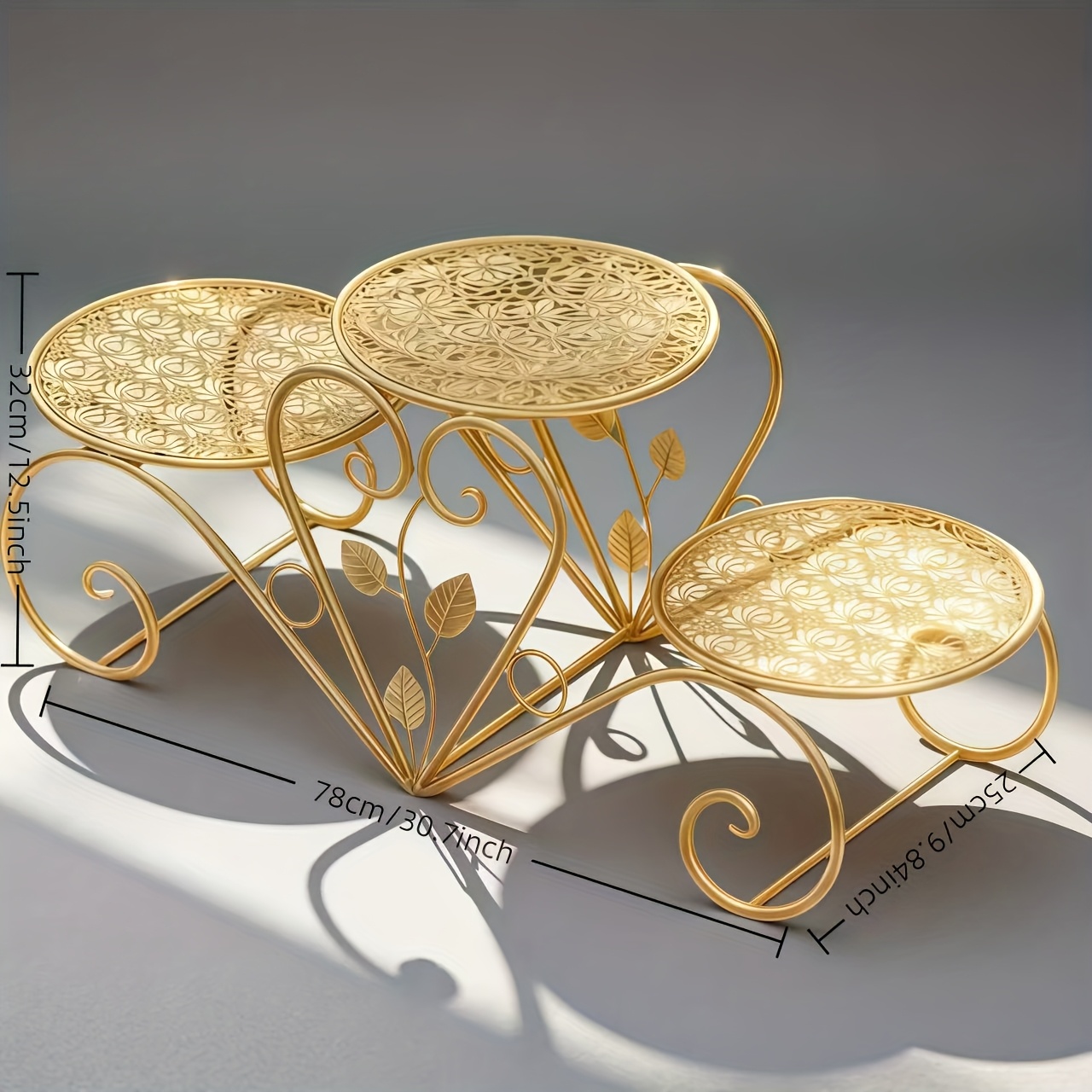 Sturdy Iron 3-Tier Decorative Stand with Curved Legs & Ornamental Leaf-like Patterns - Golden Metal Display Tray for Coffee Table, Wedding, Birthday, Christmas, Thanksgiving - Reusable Non-Food Serving Centerpiece
